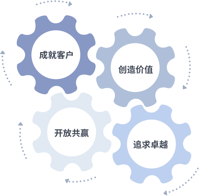 成就客户是一切决策的出发点,,创造价值是衡量所有工作的标准,,追求卓越是我们做事做人的态度,,,,开放共赢是我们的格局也是最终的结果。。。。价值观的齿轮环环相扣,,,推动着组织里的每个人不断向前。。。